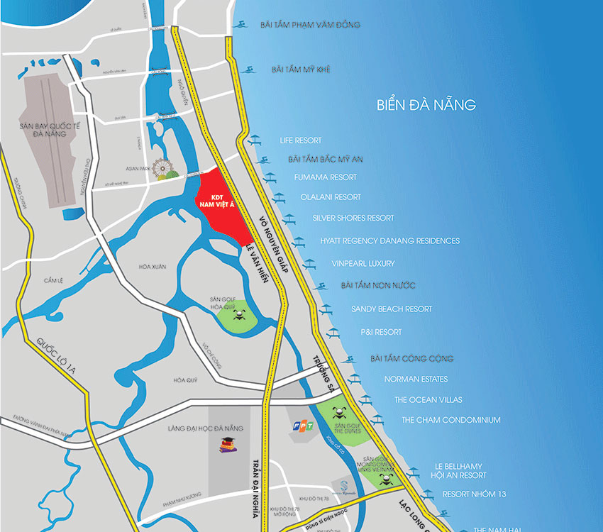 Với vị trí gần trung tâm và lại được hưởng một bầu không khí trong lành, mát mẻ do chỉ cách biển chưa đầy 400m. Nam Việt Á hội tụ đủ những yếu tố lý tưởng để xây dựng một đô thị sông nước gắn liền với môi trường cảnh quan sinh thái.
