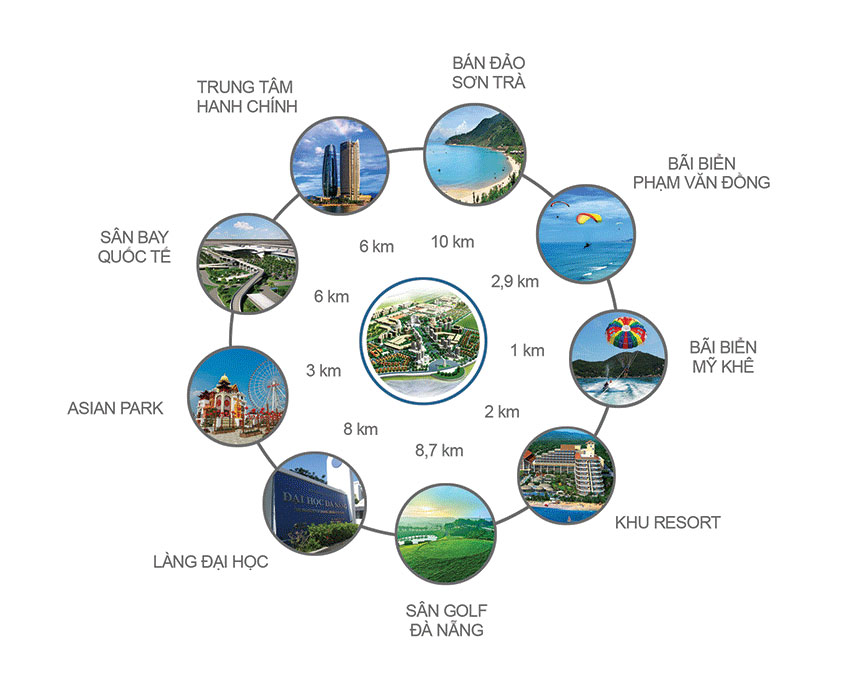 - Hướng Bắc: Trung tâm hành chính và các dịch vụ công thành phố, Cầu Rồng, Cầu Sông Hàn, Cầu Thuận Phước.
