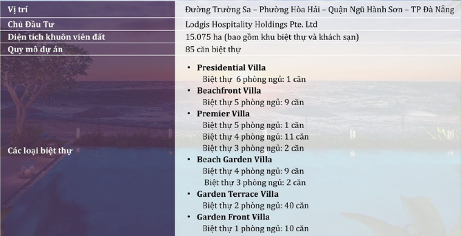 Fusion Resort & Villas Đà Nẵng gồm 85 căn biệt thự từ 1 phòng ngủ đến 6 phòng ngủ. Với diện tích từ 370m2 đến 1.718m2 đa dạng nhu cầu sử dụng. Bên cạnh đó, dự án do VinaLiving – thương hiệu bất động sản phân khúc cao cấp đại diện Tập đoàn VinaCapital làm chủ đầu tư. Quản lý và vận hành bởi Tập đoàn Fusion nhiều năm kinh nghiệm ở lĩnh vực quản lý khách sạn resort 5 sao trên toàn cầu. Lại càng gia tăng chất lượng và giá trị sản phẩm phù hợp với đẳng cấp chủ sở hữu.