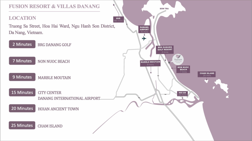 Dự án nằm liền kề với các resort đẳng cấp khác thuộc cùng một chủ đầu tư là tập đoàn VinaCapital: The Ocean Estates, Sheraton Grand Danang, The Ocean Villas,.. Và nằm đối diện với 2 sân golf đẹp nhất thành phố đáng sống là BRG, Montgomerie Links. Fusion Resort & Villas Đà Nẵng còn sở hữu vị trí thuận tiện khi dễ dàng kết nối với những địa điểm du lịch nổi tiếng. Đem đến trải nghiệm tuyệt vời mà ít dự án nào có được.
