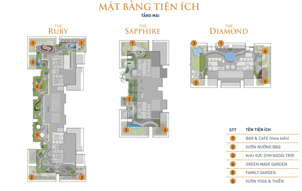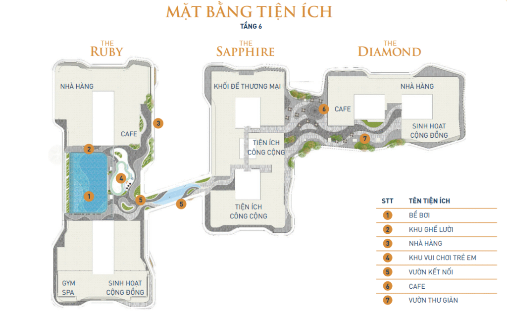 | Tiện ích | Khối đế thương mại, nhà trẻ, khu cây xanh, khu vực công cộng, bể bơi, sân vườn cảnh quan, thư viện, phòng chiếu, Bar + Café, nhà hàng….. |