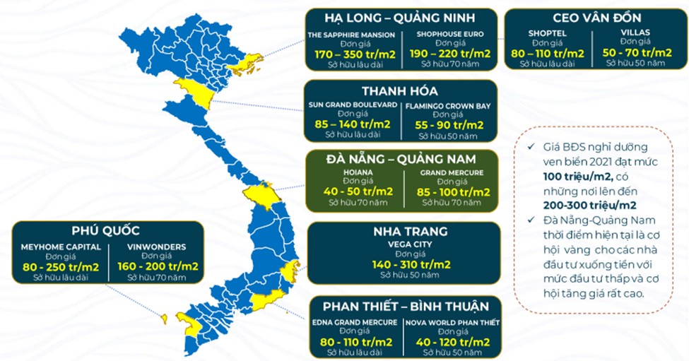 - Giá BĐS nghỉ dưỡng ven biển 2021 đạt mức 100tr/m2 có những nơi lên đến 200tr-300tr/m2