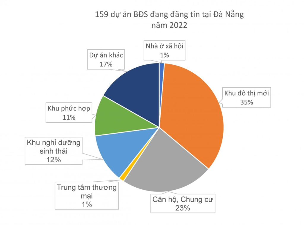 Theo dữ liệu của Luvill tại Đà Nẵng có khoảng 159 dự án BĐS đã, đang và sắp bàn giao hoặc triển khai. Trong đó, áp đảo là các khu đô thị mới với tỉ lệ 35%, dự án căn hộ chung cư là 23%, khu sinh thái nghỉ dưỡng 12%, khu phức hợp 11%, trung tâm thương mại 1%, nhà ở xã hội 1% và các dự án khác là 17%