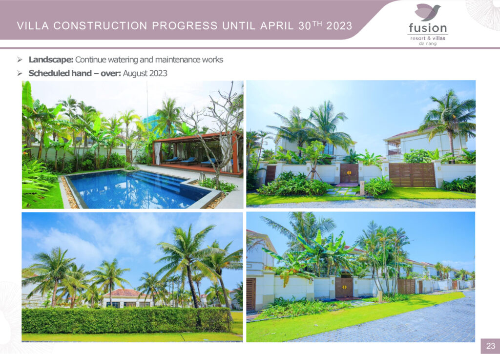 Theo kế hoạch, Chủ Đầu Tư sẽ tiến hành bàn giao đồng loạt các Biệt Thự thuộc dự án Fusion Resort & Villas Đà Nẵng vào Tháng 8/2023 và đầu Tháng 9/2023.